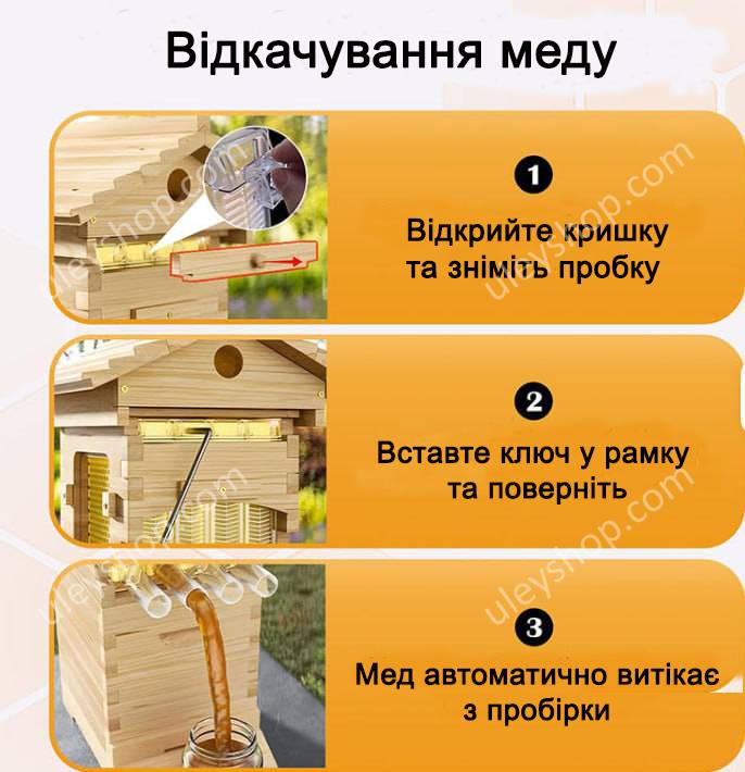 Автоматический "МИНИ" улей укомплектован специальными пластиковыми рамками, состоящими из подвижных сот многоразового использования. При повороте специального ключа-рычага происходит разделение ячеек путем их смещения по вертикали. Таким образом мед выходит из ячеек направляясь в нижние каналы рамки, а затем трубочкой в банку. Для возвращения ячеек в рабочее положение необходимо повернуть ключ в обратную сторону. (Если ячейки соединены верно, то вы легко закроете пробкой шахту для ключа. Если ячейки соединены НЕ верно, пробка не войдет в отверстие шахты для ключа).