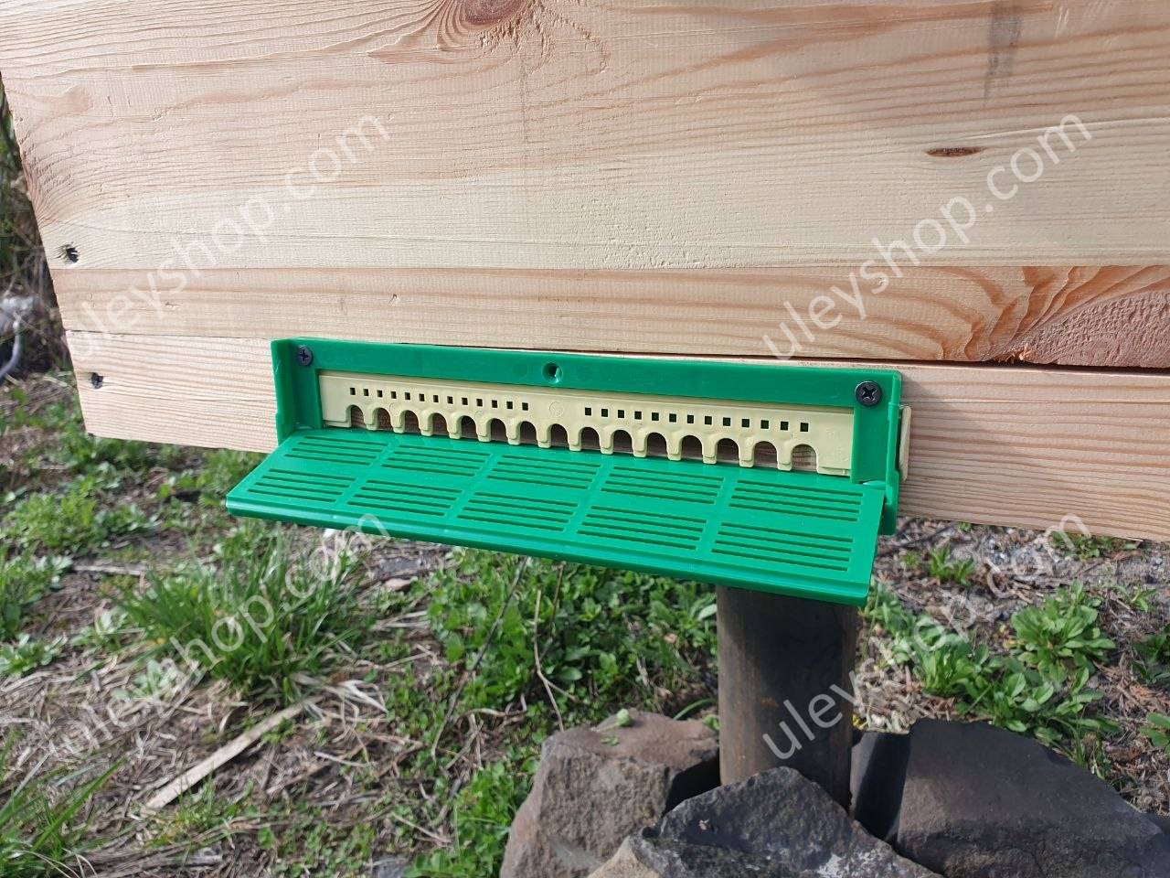 В данной конструкции одновременно присутствует пластиковый леточный заградитель и прилетная доска, в закрытом положении выполняющая функцию крышки летка. Что очень удобно при транспортировке пчел во время кочевки или перевозки пасеки на новое место. Для доступа воздуха в улей в закрытом положении прилетной доски предусмотрены вентиляционные отверстия, через которые не проходит пчела.