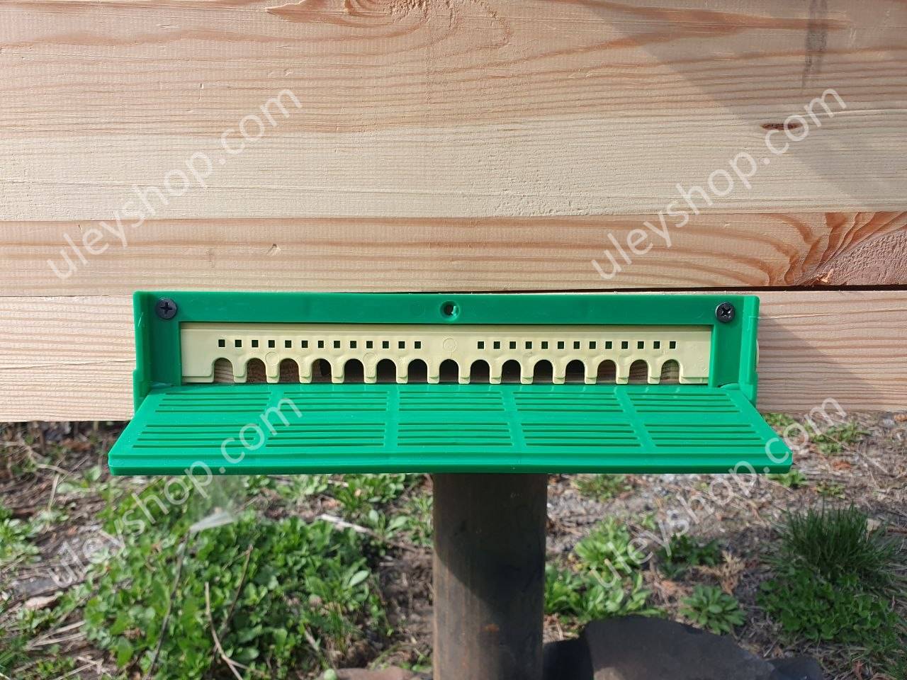 Летковый заградитель "Портал 250 мм" – крепится на дно или корпус улья так, чтобы выход из улья был по центру прилетной доски. Крепление производится с помощью саморезов в специальные отверстия, которые находятся на корпусе заградителя.