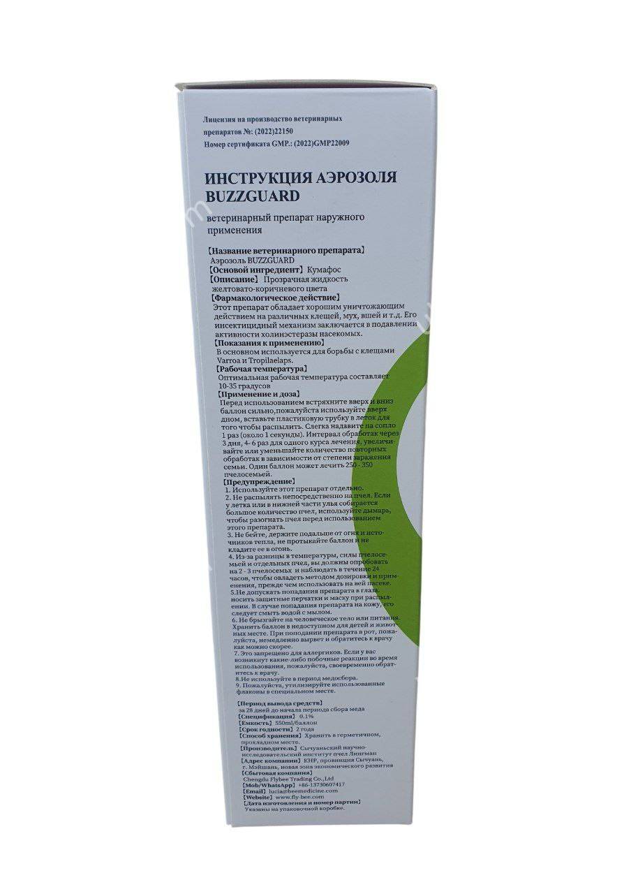 Спрей от клеща Варроа BUZZGUARD (Кумафос), 550 мл. – применяется для быстрого и качественного уничтожения клещей варроа. Кумафос - фосфорорганическое соединение, акарицид и инсектицид широкого спектра действия, используемый в ветеринарии и пчеловодстве для борьбы с клещами (в частности, Varroa destructor), вшами и другими паразитами.