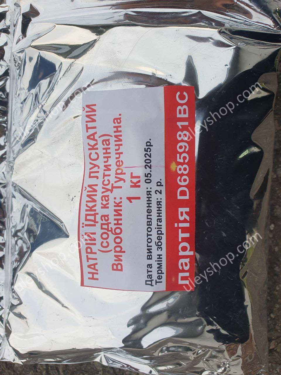 Каустична сода (натрій). 1 кг - це сильний лужний засіб, що застосовується для глибокого очищення, знежирення та дезінфекції різних поверхонь та обладнання. Швидко розчиняє жири, білкові забруднення, воскові залишки, пліснява та інші органічні відкладення.