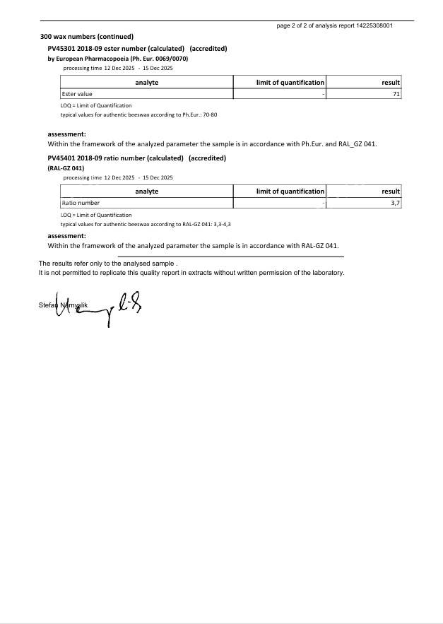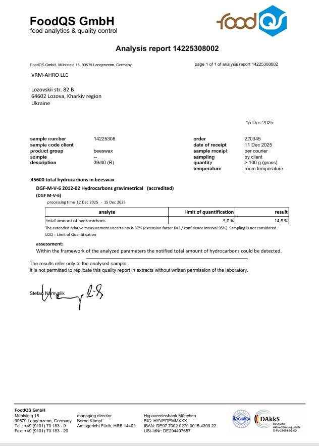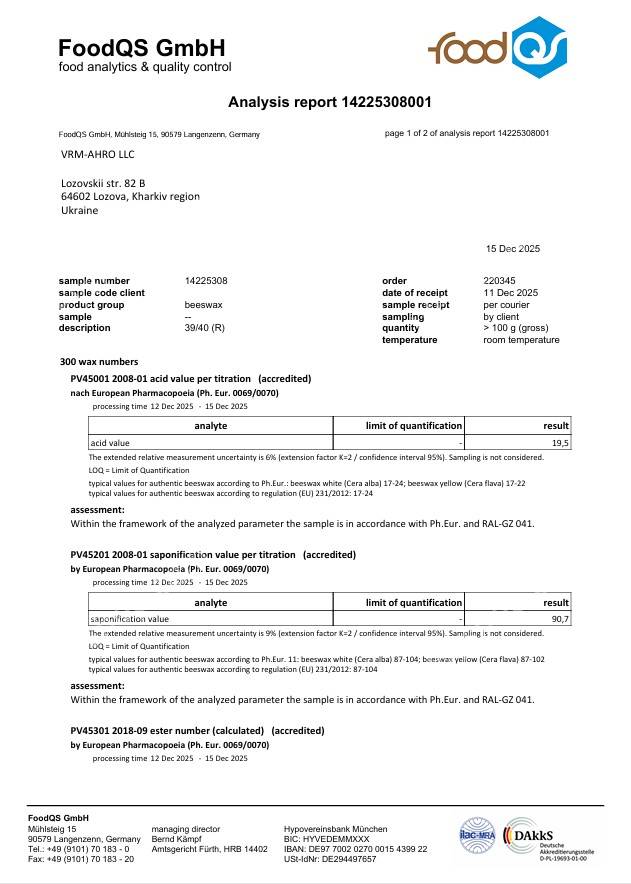 Вощина сертифікована у Німеччині (сертифікати закріплені у фото).