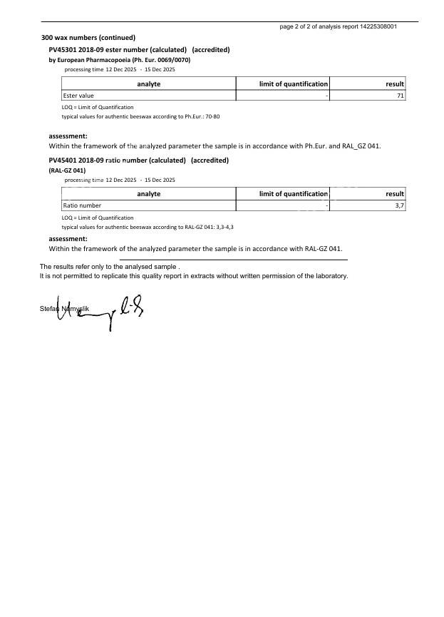 Воскосировина, яка використовується для виробництва вощини, проходить перевірку якості в німецькій сертифікованій лабораторії FOOD QS; протоколи досліджень є у вільному доступі. Активне посилання на результати перевірки конкретної партії воску нанесено у вигляді QR-коду на кожну упаковку.