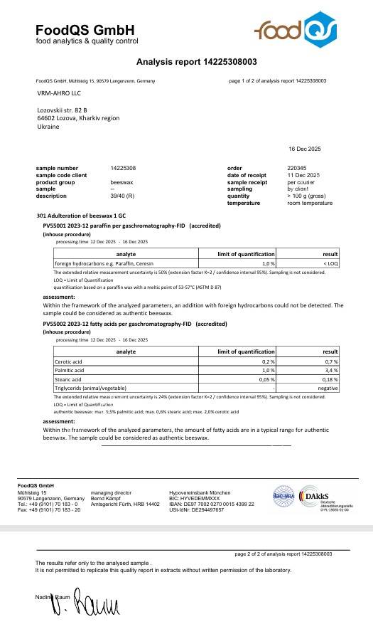Вощина сертифікована у Німеччині (сертифікати закріплені у фото).