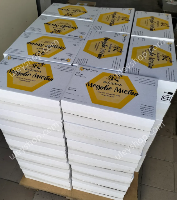 Вощина виробництва "Медове Місто" під рамки «Дадан, Рута та магазинна рамка» 5 кг. – вощина з пасічного воску на рамки «Дадан, Рута та напіврамка» в упаковках по 5 кілограм, представлена у зручному фасуванні. Відмінною рисою вощини є високий ступінь очищення воскосировини, що використовується, за інноваційною екологічно безпечною технологією без використання хімреактивів.
