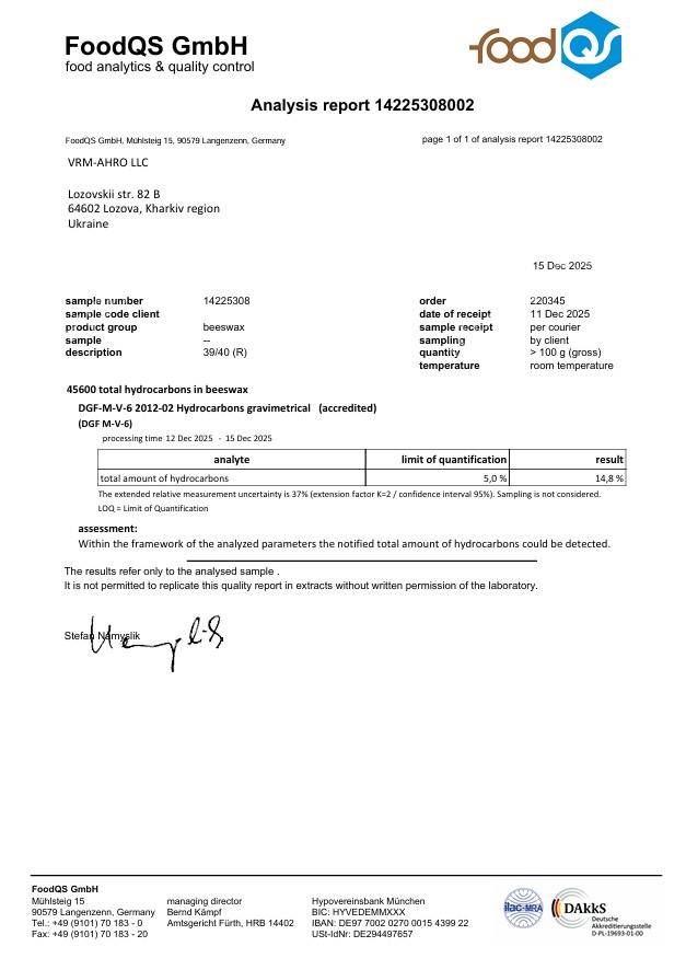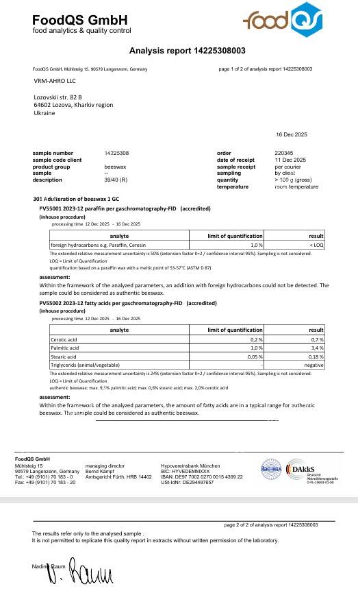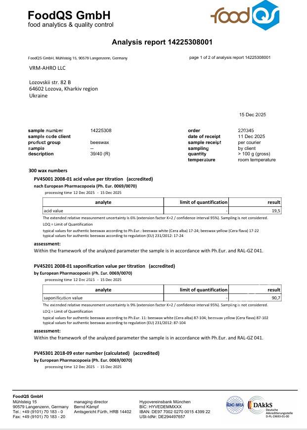 Вощина сертифікована у Німеччині (сертифікати закріплені у фото).