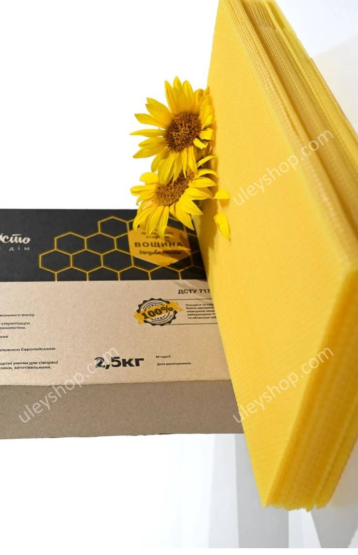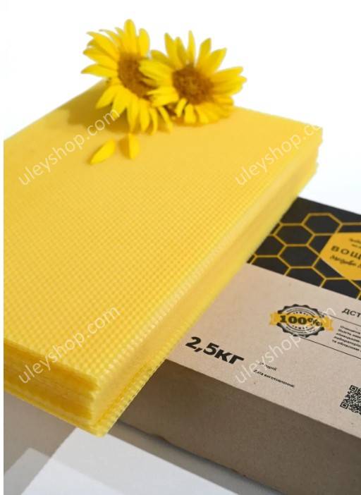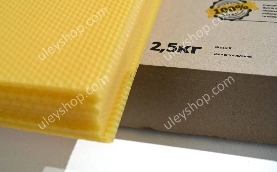 Вощина производства "Медове Мисто" под рамку "Дадан" 2.5 кг. – Вощина из пасичного воска на рамку «Дадан» в упаковках по 2.5 килограмм, представлена в удобной фасовке. Отличительной чертой вощины является высокая степень очистки используемого воскосырья по инновационной экологически безопасной технологии без использования химреактивов. Также этот размер покупают для установки на «полурамку», вручную разрезая лист пополам.